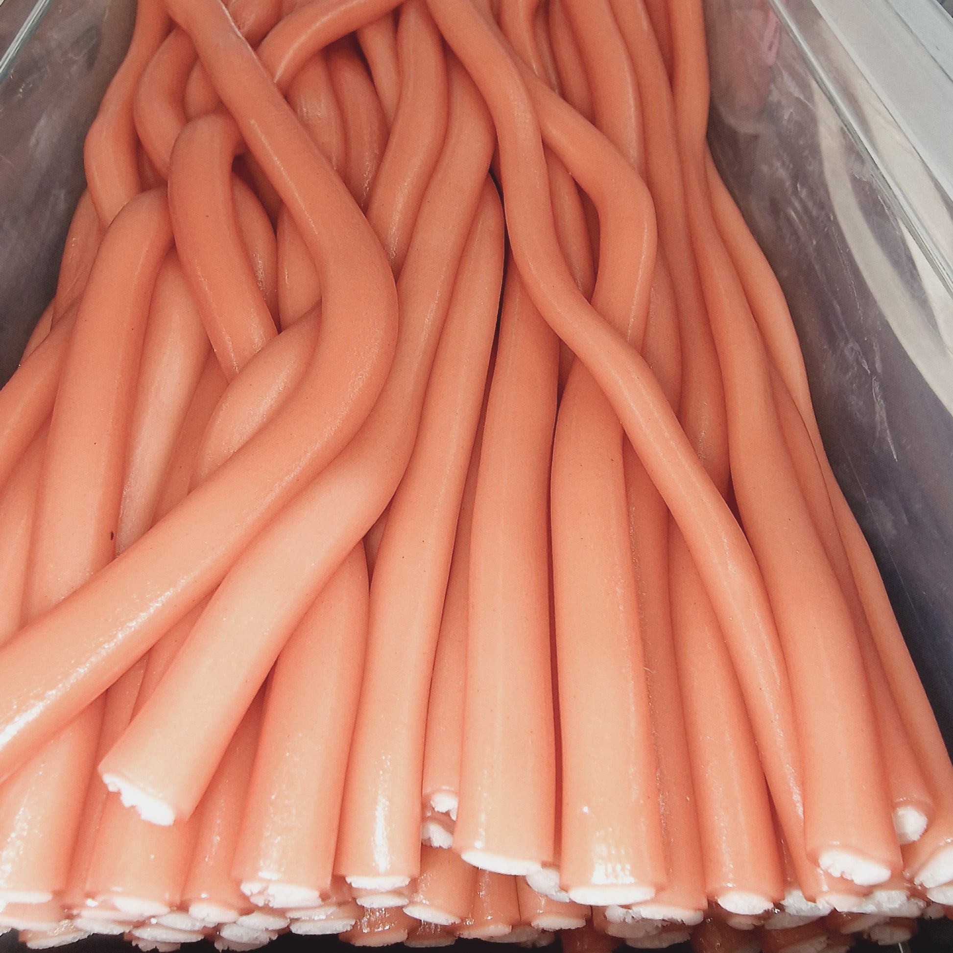 Sukker, glukose-fruktosesirup, hvetemel, maismodifisert stivelse, vann, sitronsyre, fuktighetsbevarende middel, potetstivelse, vegetabilsk fett: palme, biffgelatin (halal), kunstig smak, trinatriumsitrat, beleggmiddel: palmeolje, emulgator: E471 , Farger: E129