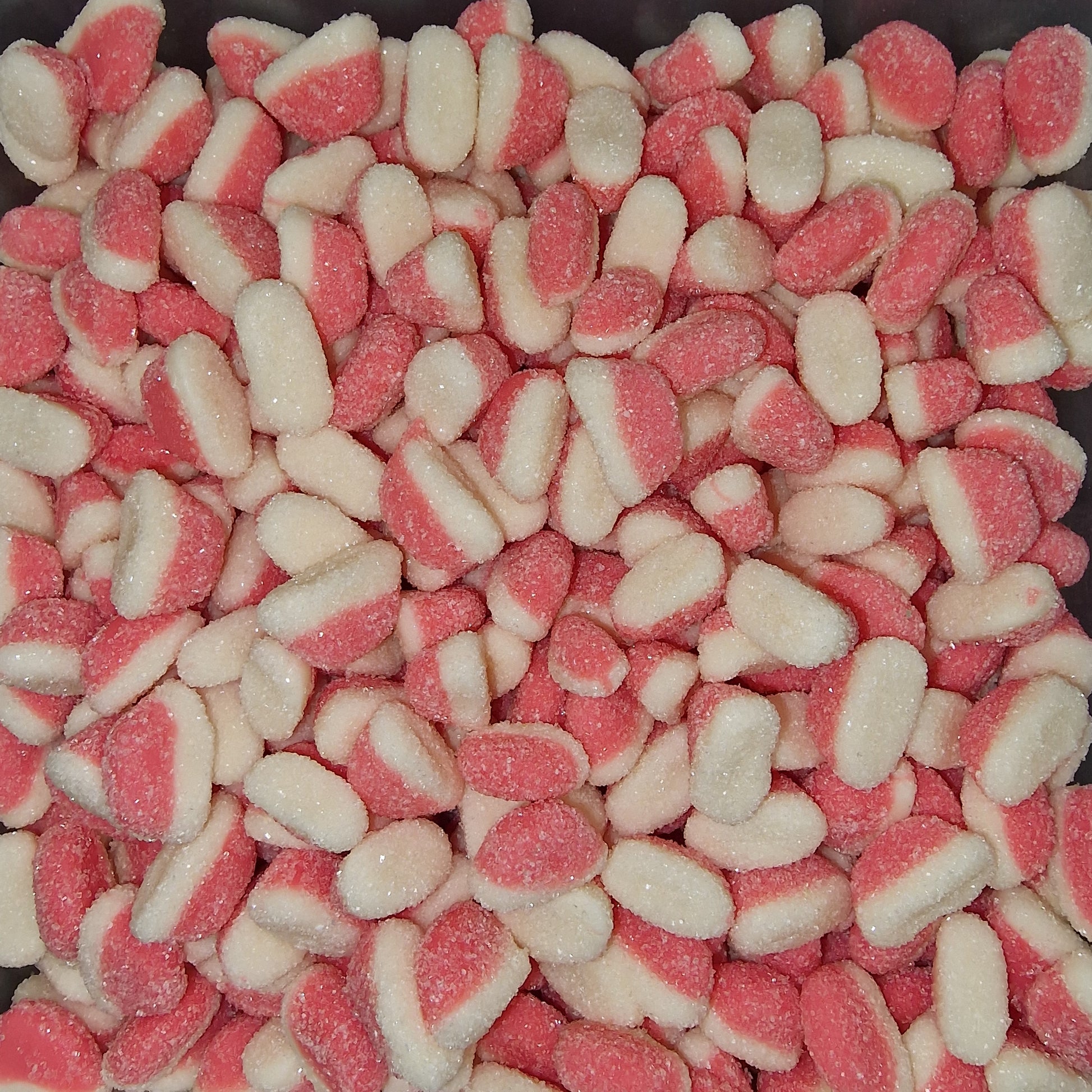 Glukosesirup, sukker, maisstivelse, biffgelatin (halal), sitronsyre, eplejuice fra konsentrat (1%), farger: E163, E171, jordbærekstrakt, smakstilsetninger